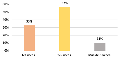 Dentro del grafico 8, se presenta que el 33% de los diabéticos han acudido de 1-2 veces al hospital por tener el nivel de azúcar muy alto, el 57% de 3 a 5 veces y tan solo el 11% han acudido más de 6 veces.