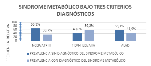 Otro aspecto importante para resaltar es el predominio de criterios bioquímicos y clínicos en cada definición aplicada. Se puede observar porcentajes más altos a partir de las definiciones ALAD y NCEP/ATP III, debido a la similitud de parámetros medibles para triglicéridos, colesterol HDL y presión arterial; por lo cual se destaca que no se encontraron diferencias estadísticamente significativas como lo detallan varios estudios similares 20.