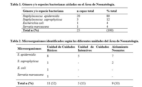 Se concluyó mediante el estudio microbiológico que la presencia de microorganismos en ambiente del área de neonatología de un Hospital ubicado al Sur del Ecuador fue de <5 Unidades Formadores de Colonias por cada muestra positiva analizada y se identificó al S. epidermidis como el agente con mayor frecuencia por ostentarse por 4 ocasiones y se identificó a la Unidad de Cuidados Básicos como la unidad con mayor continuidad de colonias por presentar un crecimiento de 11 colonias bacterianas; concluyendo que la presencia de microorganismos en el Hospital estudiado fue mínima.