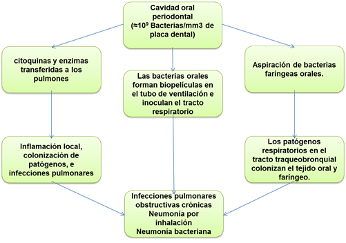 En pacientes periodontales, un mm 3 de placa dental puede contener aproximadamente 10 9 bacterias y, por lo tanto, podría servir como un grupo persistente de posibles patógenos orales / respiratorios que podrían verterse en la saliva y aspirarse en el tracto respiratorio inferior y los pulmones para causar infección (Scannapieco, 1999) (Figura 4). Además, las citocinas y enzimas inducidas por los tejidos periodontales inflamados también pueden reubicarse en los pulmones y desencadenar procesos inflamatorios locales e infecciones pulmonares (Scannapieco, 2001).