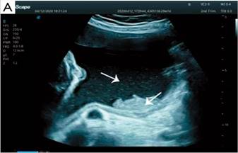 Figura 2. Ecografía tridimensional. Partículas flotantes en el líquido amniótico (flechas). prenatal con genotipado rápido de SNP-array en sangre del cordón umbilical.