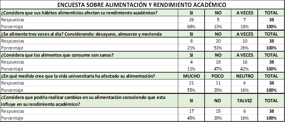 Los hábitos alimenticios de los estudiantes universitarios están caracterizados por constituirse de alimentos pocos nutritivos y llenos de grasas saturadas. Por esta razón, el rendimiento académico del mismo se ve condicionado generando una falta de concentración, fallos en la memoria y cansancio físico. Si bien el rendimiento académico no puede ser asociado únicamente con los hábitos alimentarios como variables que lo determinan (factores institucionales, pedagógicos, psicosociales y sociodemográficos tienen también enorme relevancia al respecto), se ha comprobado que las costumbres inciden en la nutrición de los estudiantes y, por tanto, en el desempeño académico de estos. 8 9 10