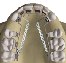 Se puede emplear un enfoque convencional que utiliza brackets linguales de rutina para la retracción de los dientes anteriores si los requisitos de anclaje no son severos. Los brazos de poder se unen al arco de alambre y se colocan dos micro implantes en el paladar, los brazos de poder se unen a los microimplantes mediante cadenas elásticas para generar la fuerza de retracción (Figura 4) 5 8