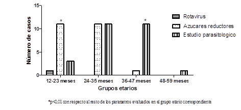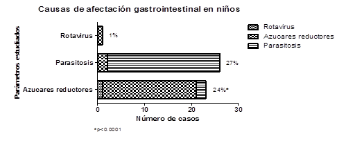 En la figura 2 se encontró mayor significancia clínica (p<0,0001) en los casos relacionados a azucares reductores, al estar asociados a casos de parasitosis y de rotavirus en los niños analizados.