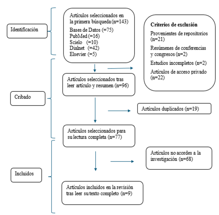 Se tomó una población de estudio mediante la búsqueda de distintas bases de datos reconocidas en el medio como PubMed, Scielo, Elsevier y Dialnet con el objetivo de obtener una amplia gama de información respecto al tema para lo cual se utilizaron términos específicos de abordaje al tema propuesto. La población total del estudio fueron 143 artículos y para la selección de la muestra se tomaron los siguientes criterios de inclusión: estudios publicados en revistas científicas y médicas, publicados en un intervalo de tiempo de 5 años del 2020 al 2024. Y como criterios de exclusión: Estudios provenientes de repositorios, resúmenes de conferencias, presentaciones en congresos, estudios inaccesibles al texto completo, resúmenes de conferencias o presentaciones en congresos, artículos en diferente idioma, y estudios duplicados.
