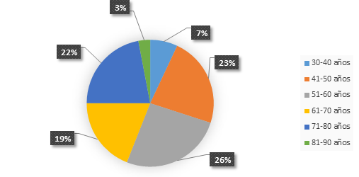 En la tabla y grafico 1, se presenta el análisis del indicador edad. En la misma se indica que el 26% del total de los sujetos investigados tiene entre 51 - 60 años de edad. Seguido del 23% y 22% que se ubicaron en edades de 41 – 50 y 71-80 años de edad respectivamente. Por otro lado, el 19% manifestaron tener entre 61 y 70 años de edad. Los menores porcentajes se indicaron para sujetos con edades mayores a 81 y entre 30-40 años de edad.