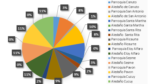 En la tabla y grafico 5, se presenta el análisis del indicador procedencia. En la misma se indica que el mayor porcentaje con el 11% proceden del Aledaño Eloy Alfaro, Sesme, Pavon y Cucuy. Seguido del 10% que procedían del Aledaño de San Antonio. Por otro lado se observa que el 9% procedían de la parroquia y Aledaño Ricaurte. Los menores porcentajes de los Aledaños y parroquias Canutos, Santa Rita y de las parroquias Santa Marta y Eloy Alfaro. Se destaca el hecho en la cual el Aledaño Santa Martha y las parroquias Sesme, Pavon, Cocuy y Canuto, no se presentaron pacientes con diabetes.