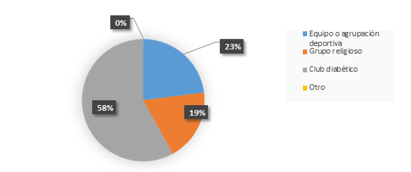 En la tabla y grafico 8, se presenta el análisis del indicador Participación Social. En la que el 58% expresaron pertenecer a un club de diabéticos y el 23% manifestó pertenecer a un equipo o agrupación deportiva. Seguido del 19% que pertenecen a un grupo religioso.