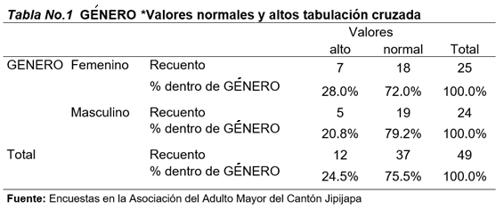 Los exámenes arrojaron que, el 20,8% del género masculino (5 individuos) mantenían valores por encima de lo normal, así como el 28% de las féminas (12 mujeres), por lo que del total de la muestra fueron identificados con valores superiores al permisible el 24,5% de los ancianos. Ver Tabla No 1.