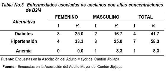 Culminado el estudio se comprobó que, a pesar de tener hábitos de vida bastante saludables, sin prácticas tóxicas, índices de masa corporal adecuados a sus parámetros físicos y un nivel de actividad poco sedentario, las afectaciones a la salud más comunes en la región, en conjunto con el proceso normal de deterioro de órganos y funciones por envejecimiento, ha incidido en que un 24,5% de los ancianos sometidos al estudio presenten concentraciones de Beta2-Microglobulina por encima de los parámetros aceptados, por lo que se estima que muestren enfermedad renal en algún grado.
