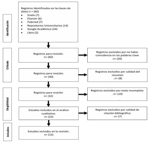 En la Figura 1 se muestra el flujograma de PRISMA aplicado en la presente investigación. Mediante la revisión de 60 artículos científicos se los clasifico de acuerdo a los criterios de inclusión y exclusión de los cuales: se excluyó 20 artículos por no haber coincidencia en las palabras claves que no tenían en el tema en estudio, se continuo revisando la calidad del resumen en la que se excluyó 8 artículos que no reunían aspectos relevantes de interés para la investigación, quedándonos 32 al momento de revisar todo el documento no se encontró completo se eliminó 10, nos quedó un total de 22 artículos de los cuales eran estudios de caso 7 no reunían los criterios de inclusión por lo cual se eliminó, al final me quede con 15 artículos con los que se ha realizado la investigación.